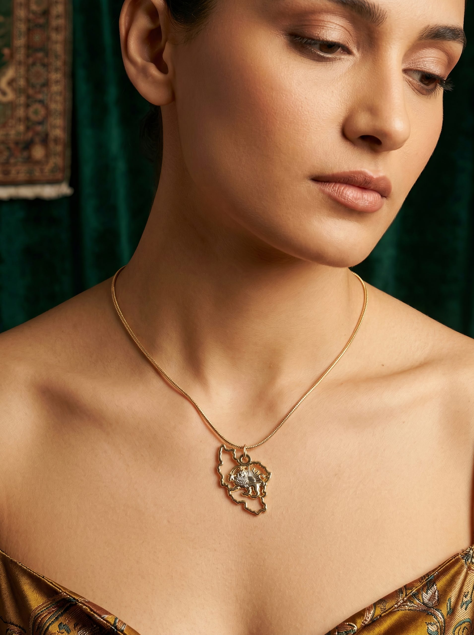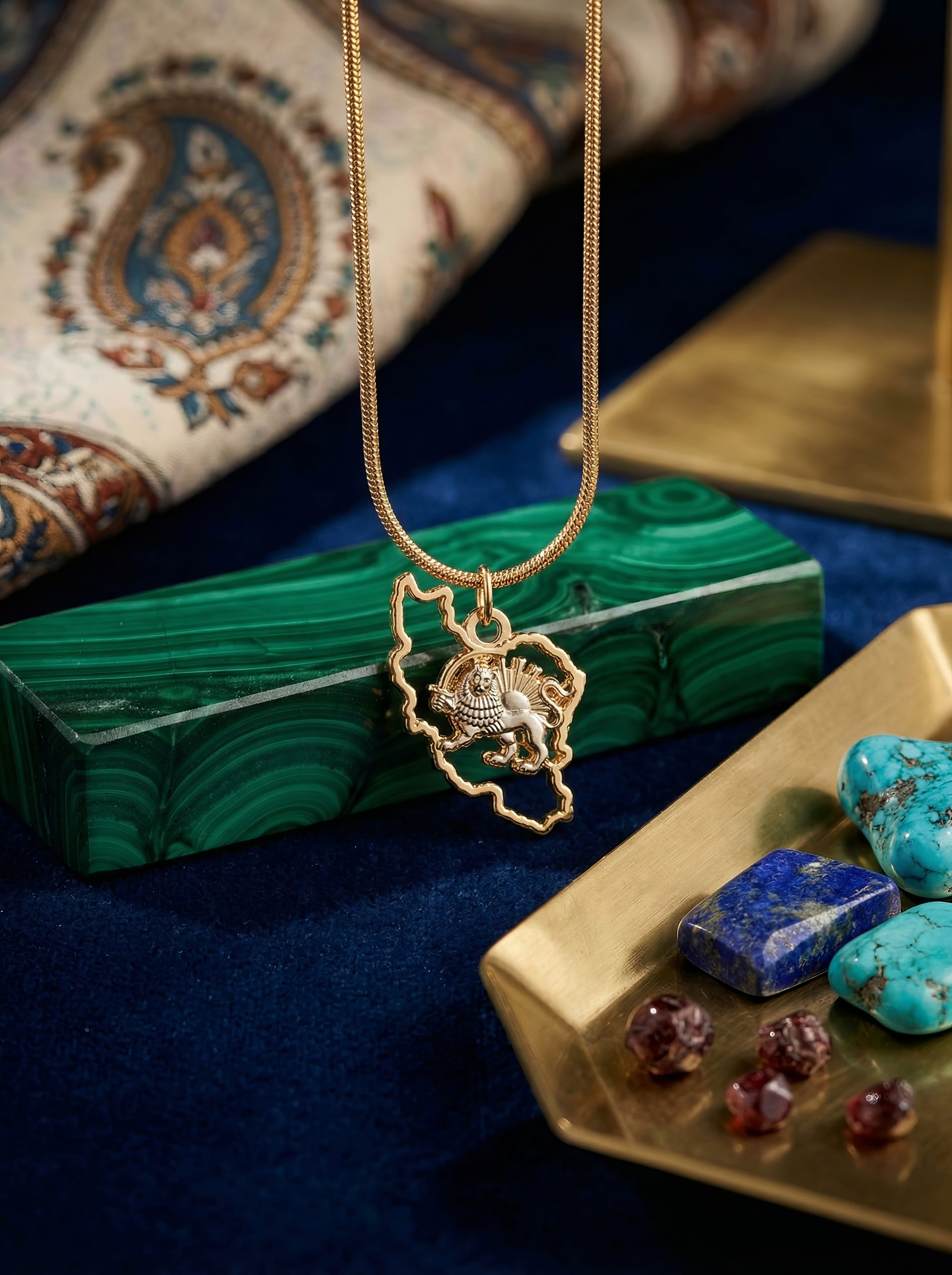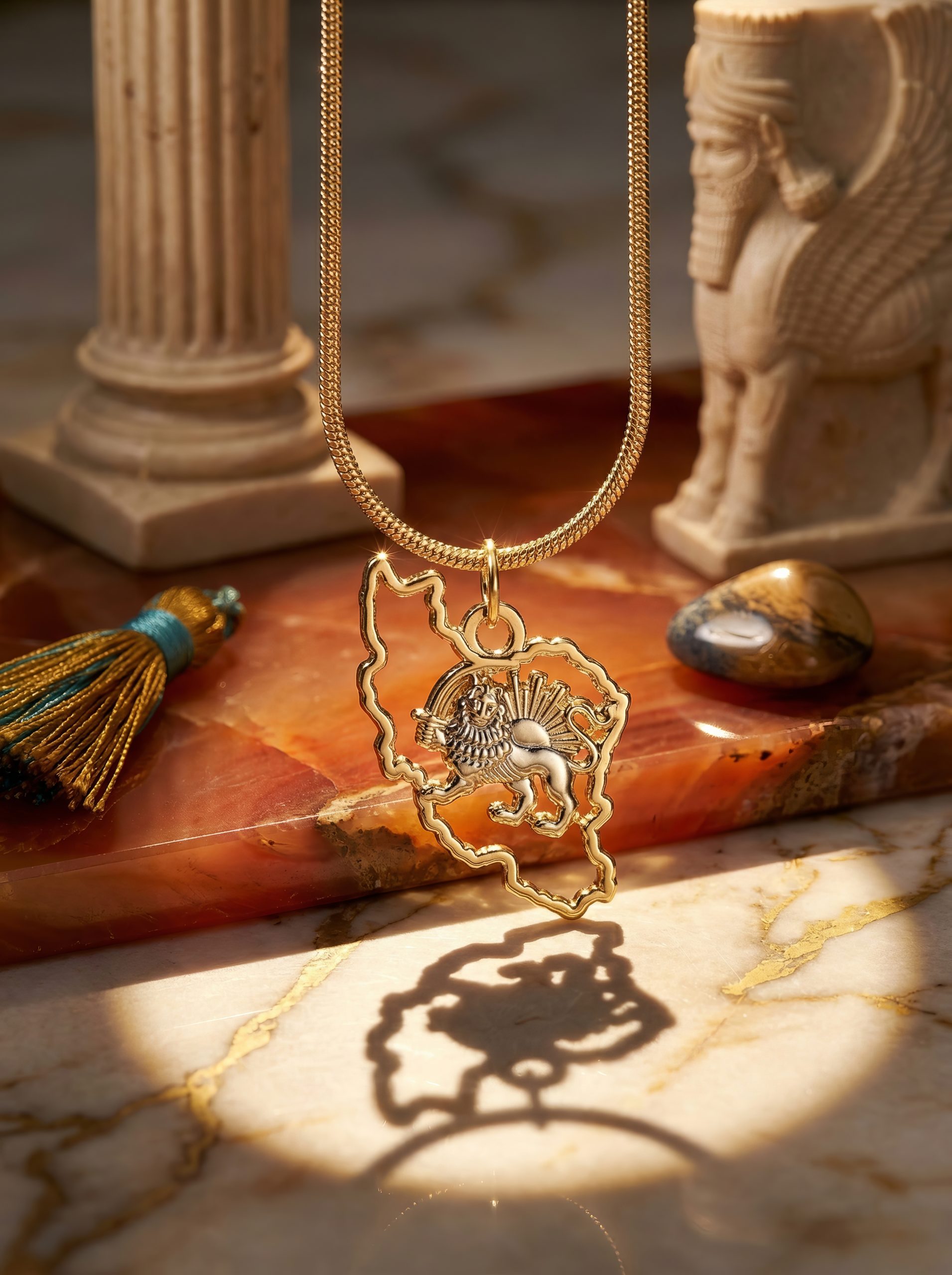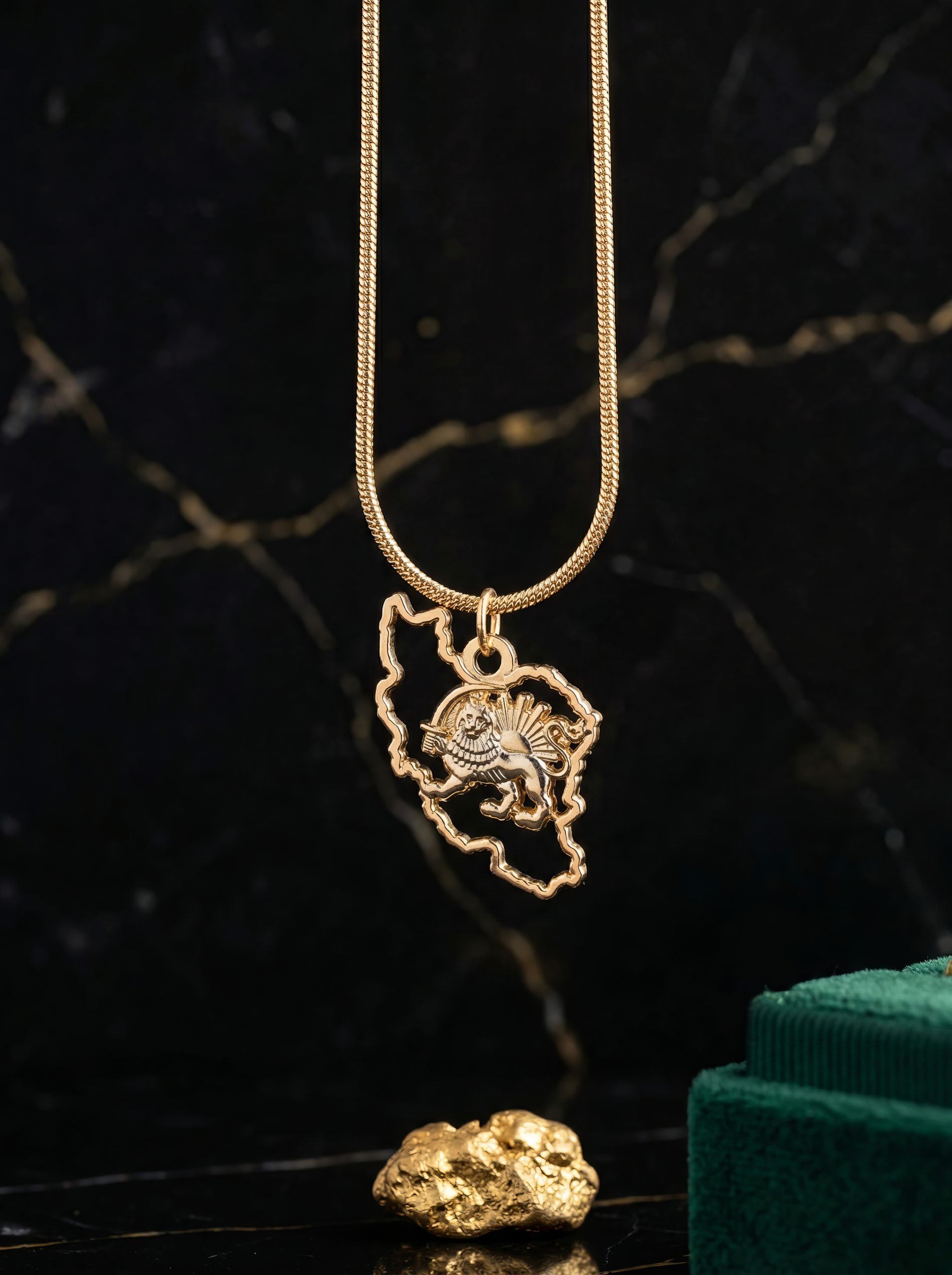 The Iran Map Outline Necklace with Lion & Sun is crafted from 18K gold plated metal, featuring a detailed 35mm pendant suspended from a 50cm chain. Bold yet refined, it is designed to be worn as a statement of identity, pride, and timeless style.