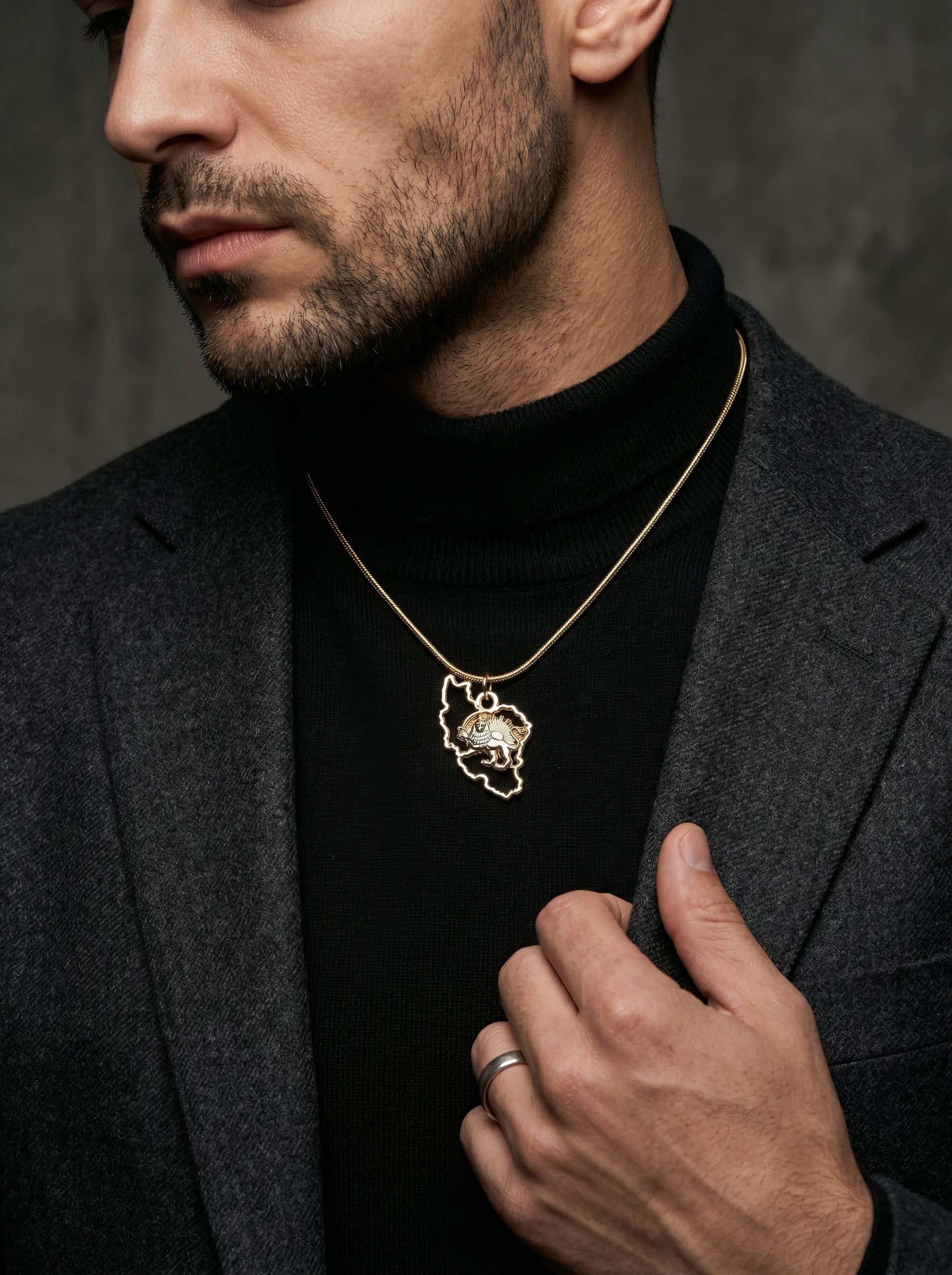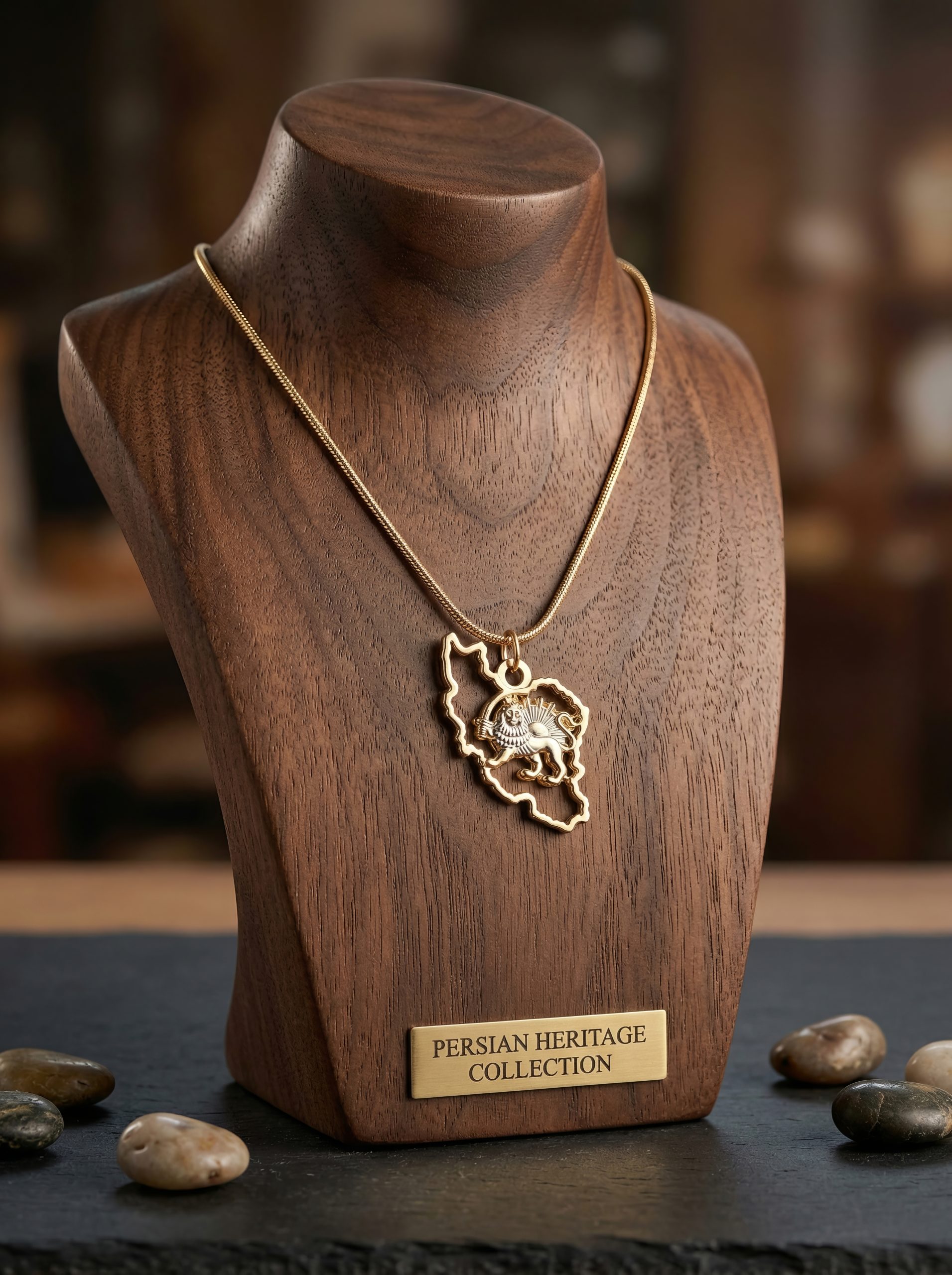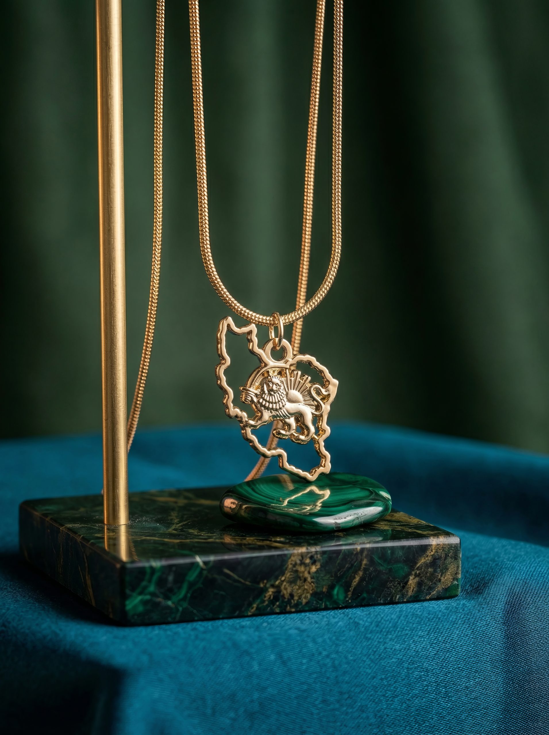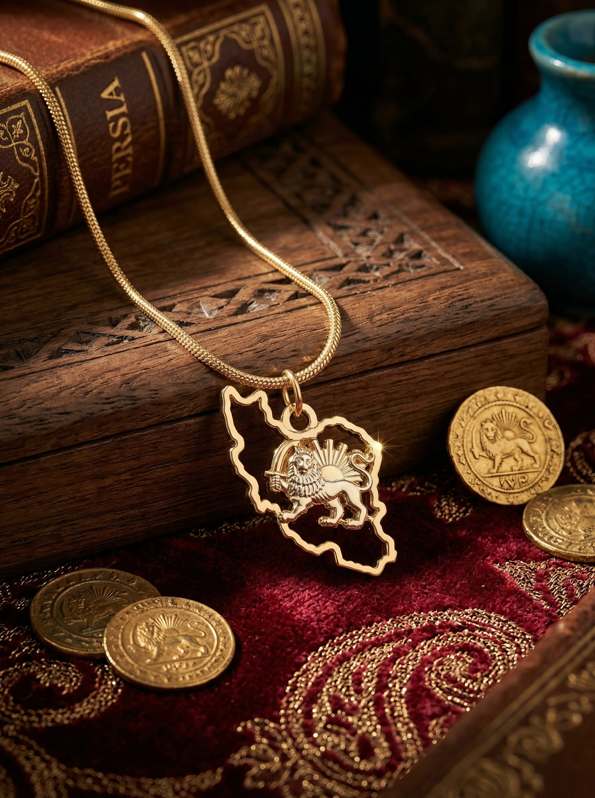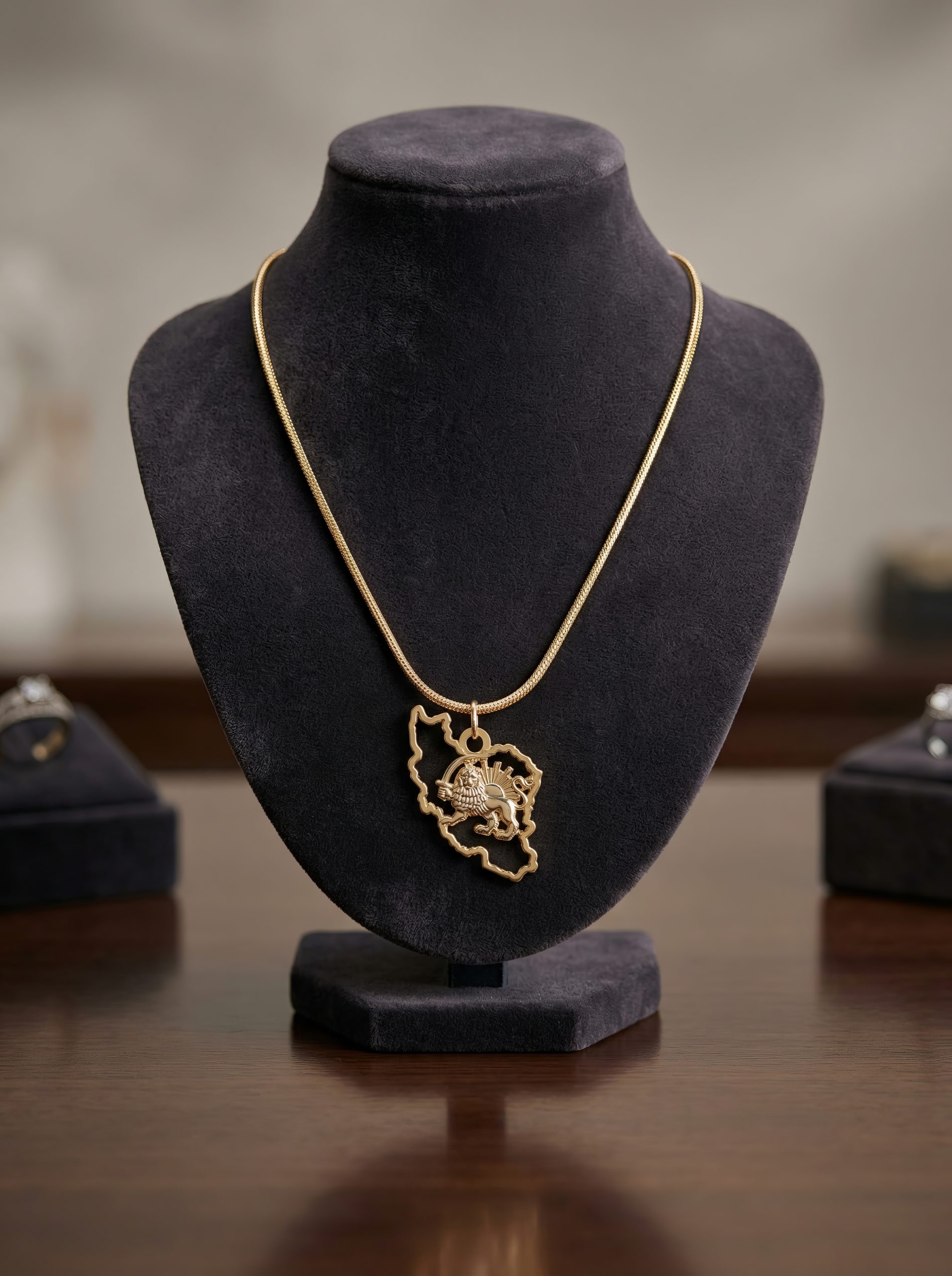The Iran Map Outline Necklace with Lion & Sun is crafted from 18K gold plated metal, featuring a detailed 35mm pendant suspended from a 50cm chain. Bold yet refined, it is designed to be worn as a statement of identity, pride, and timeless style.